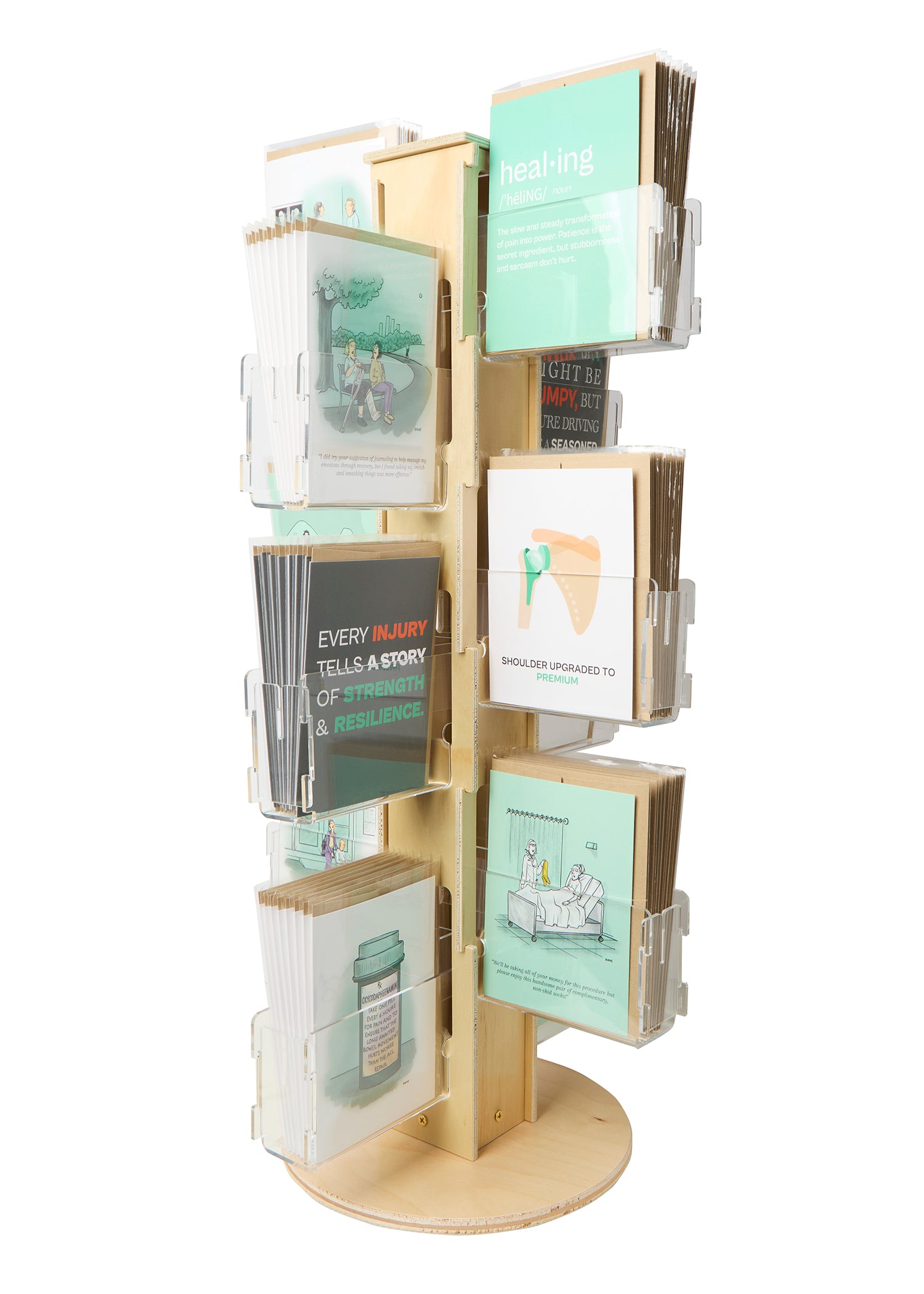 Choose from countertop displays or spinners that fit any space. We provide the display, signage, and materials at no cost—it’s a built-in resource that helps patients get more out of their recovery. Each display combines quick lessons, mindset tips, and light humor to keep your patients motivated—making progress easier for them and engagement effortless for you. Everything runs through QR codes, so there’s no inventory, restocking, or management required.